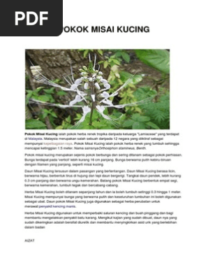 Nama Saintifik Misai Kucing - Berkesan untuk merawat penyakit buah pinggang gout diabetis dan hipertensiIa menjadi salah satu kegemaran kucing memakannya untuk menambah tenaga terutama kucing jantan yang mampu melayan berapa banyak kucing betina. Malaysia merupakan salah sebuah daripada 12 negara yang diiktiraf sebagai mempunyai kepelbagaian. Mengikut kajian yang sudah dibuat daun nya yang sudah dikeringkan adalah bersifat diuretik dan membantu menyingkirkan asid.